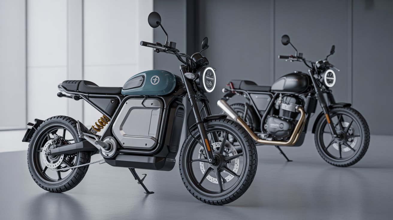 An electric and a petrol motorcycle parked side by side in a professional showroom, showcasing design and build differences.